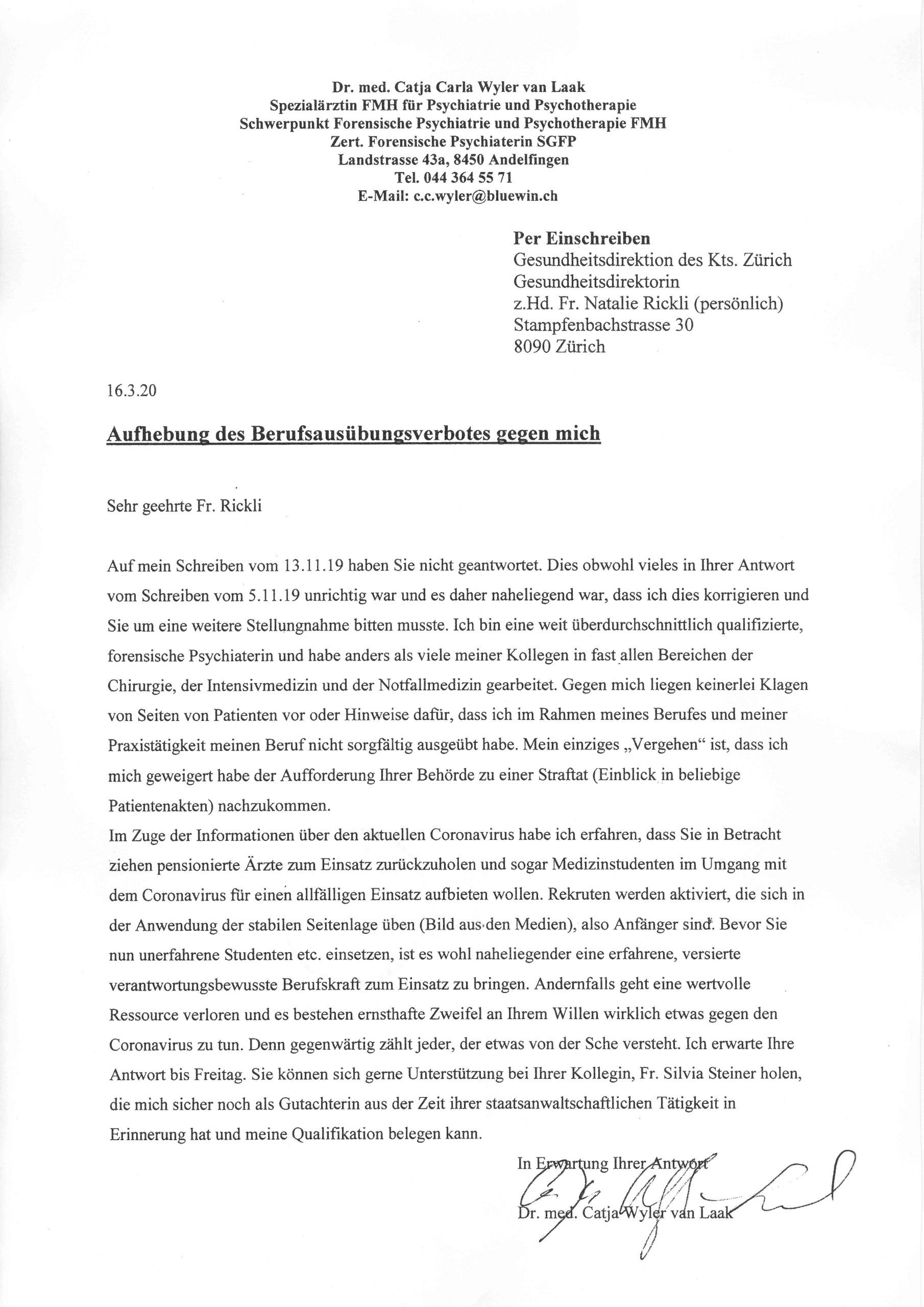 Das Schweizer Gesundheitssystem hat der Krise standgehalten, aber auch dort scheint man es nicht besonders ernst gemeint zu haben mit der Rekrutierung der Fachleute. Nachdem sich abzeichnete, dass es im Rahmen der Coronakrise möglicherweise zu einem Fachkräftemangel kommen könnte, schrieb ich der Gesundheitsdirektion des Kantons Zürich, sie möge mir die Erlaubnis geben, da ich Erfahrung in der Notfall- und Intensivmedizin habe, mich für Corona Erkrankte in Spitälern einzusetzen. (siehe nachfolgenden Brief vom 16.3.20 an die Gesundheitsdirektion des Kantons Zürich)