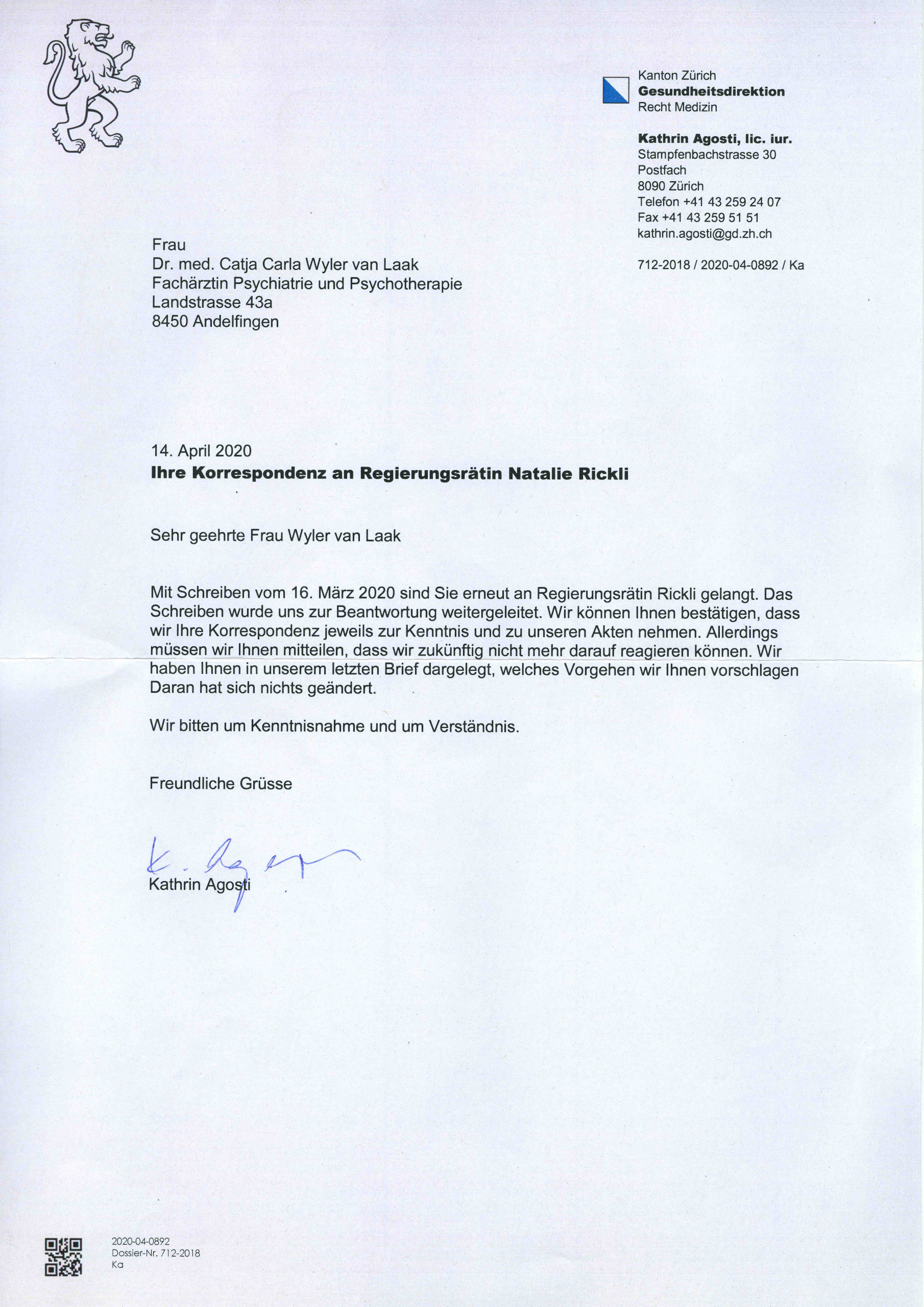 Die Gesundheitsdirektion liess sich wochenlang Zeit bevor sie mir folgendes Antwortschreiben zustellte. (Antwortschreiben der Gesundheitsdirektion des Kts. Zürich vom 14. April 2020)